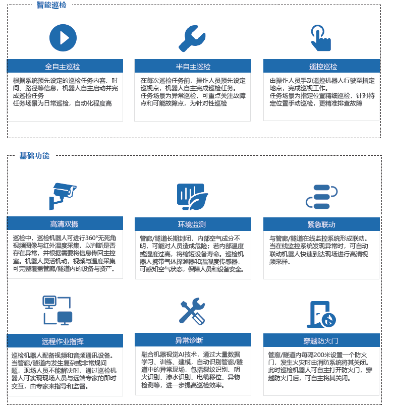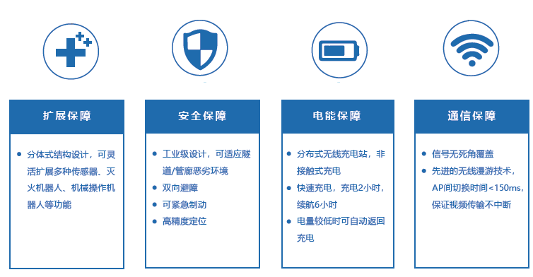 巡檢機器人的可移動(dòng)性使其能夠對電纜隧道監控實(shí)現空間無(wú)死角監控,緊急情況時(shí)可以及時(shí)趕到第一事故現場(chǎng),把現場(chǎng)的視頻、圖像、有害氣體含量等信息及時(shí)送回指揮中心;同時(shí)也可以執行應急對講指揮等相關(guān)的處置措施,起到更好的防災減災的效果。